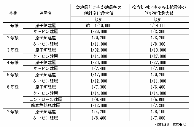 建屋傾斜変化は下表のとおりの結果となり、建屋に構造上影響を与えるような大きな傾斜は発生していない。建屋傾斜は沈下限界値(0.5〜1.0×10-3rad(1/2,000〜1/1,000):「常時の加重に対する沈下限界値の目安」建築基礎構造設計指針 2001改定(日本建築学会))に対し十分下回っていると判断できる。