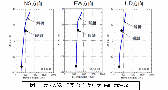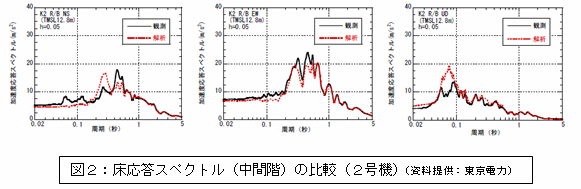 地震時の実情を踏まえた解析結果は、地震観測記録を比較的良好に再現することが出来た。(設計時に想定した値をもっとも大きく超えていた2号機の例を図1、2に示す。) |