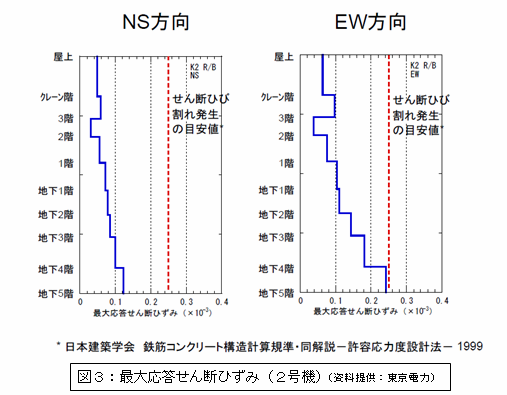 今回の評価では、地震観測記録から、建屋応答の再現のシミュレーション解析を行い、それを基にした原子炉建屋の最大応答せん断ひずみを算出し、せん断ひび割れ発生の目安値(日本建築学会鉄筋コンクリート構造計算基準・同解説―許容応力度設計法―1999)との比較が行われた。