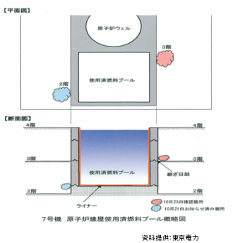 東京電力鰍ナは、漏えいはウェルの水抜きに伴う水位低下とともに減少していることから、原子炉ウェルの漏えい水の廻り込みであると推定しており、今後ウェルの調査を行い(添付工程表参照(出展:東京電力プレスリリース))、漏えい箇所を特定する予定(右図参照)。 |