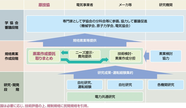 個々の民間規格について素案作成などの支援活動を行う。また、活動を通じて得られた技術情報は、原技協の技術基盤として蓄積し、今後の活動を支えるベースとする。