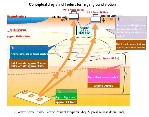 On the station site, there was a difference in the amplification of the ground motion between the Unit 1 to 4 side and the Unit 5 to 7 side due to the effects by the old underground fold structure underneath the station site. Earthquake ground motion for the Unit 1 to 4 side were about twice as large compared to the Unit 5 to 7 side. |