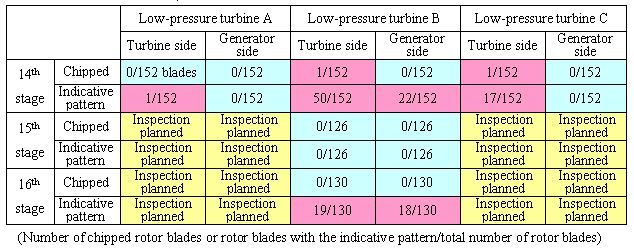 It is possible that chipping and other phenomena found on the rotor blade s up to now may have occurred before the Chuetsu-oki Earthquake. However, Tokyo Electric Power Company will continue to investigate the cause including its relation with the earthquake. It will also continue to conduct external visual inspection and non-destructive examinations of the Unit 6 low-pressure turbine A and C 14th stage rotor blade forks and the low-pressure turbine B 15th and 16th stage rotor turbine forks as well as non-destructive examination of the low-pressure turbine 14th stage rotor fork attached area. |