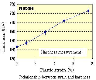 Based on the test results, low-cycle fatigue may be assessed with the existing method even with the presence of pre-strain of approx. 8%.This means that the "hardness method", which has the strain detection precision on the order of several %, can generally determine the presence of significant strains that could affect the plant.