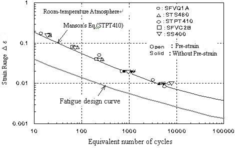 To evaluate the impact of strains caused by seismic load on material strength and fatigue life, five types of steel (SUS304TP, STP480, STPT410, SFVC2B, and SS400) as main pipe materials, in addition to the three types of steel evaluated the previous year, were evaluated in FY2008 for data enhancement. Figure 4 shows the fatigue test on pre-strained material and the impact of repeated pre-straining on the fatigue life of ferrite steel. The impact of repeated pre-straining on the mechanical quality and fatigue life of both ferrite steel and austenite stainless steel was insignificant. It was found that sufficient life margins against the design fatigue curves could be ensured for both steel types. Thus, it was confirmed that the alternate load resulting from the Chuetsu-oki Earthquake did not affect material strength and that the fatigue life of components can be assessed with sufficient margins by cumulative fatigue coefficient evaluation based on the design fatigue lines.