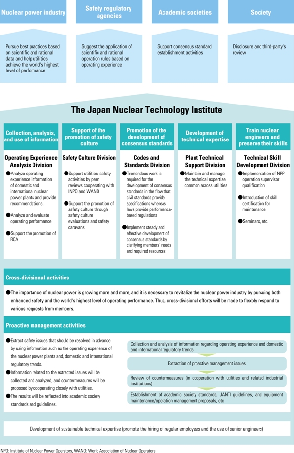 The Japan Nuclear Technology Institute (JANTI) develops technical expertise and supports utilities in promoting safety activities, and aims to further enhance the safety of nuclear power. This contributes to the revitalization of the nuclear power industry, which is the common interest of its members. JANTI was thus established as an organization that combines the collective effort of the nuclear power industry by consolidating and restructuring the functions of the Central Research Institute of Electric Power Industry Nuclear Information Center, and the Nuclear Safety Network (NS Net), assuming operations, and providing functions such as developing consensus standards. JANTI is also independent from nuclear operators and exercises a supervisory role from an objective, third-party standpoint. Furthermore, with regards to the activities of the Institution, the transparency of management is enhanced through information disclosure and the review by of a board of councilors comprising external members.