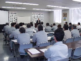 About 40 persons, including the staff of Ariake Machine Works and cooperating companies attended the Safety Presentation. At the beginning of the Presentation, Mr. Takeo Koike, President of Hitachi Zosen Diesel and Engineering Co., Ltd. gave an address and said, "We are engaged in the manufacture of nuclear-related machinery and recognize the safety management of nuclear energy as a whole as a very important subject of daily activities. Although safety management is our daily routine, internal control tends only to be dependent on the tolerance of the internal staff. We would like to review our daily safety management through today's presentation and information exchange sessions."
