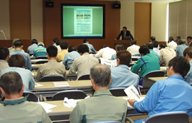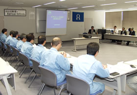 About 60 persons, including the employees of Higashidori Nuclear Power Station and cooperating companies, attended the Safety Presentation. At the beginning of the Presentation, Mr. Inoue, Deputy Senior Officer : General Manager of Higashidori Nuclear Power Station(under Construction), Tohoku Electric Power Co., Inc., gave an address and said, “I would like to thank you very much for holding this visit of the Safety Caravan in order to spread a security culture. As for the construction of the Higashidori Nuclear Power Station, core loading is scheduled for December, and we consider that we are now in a period where we implement safety more than ever in concrete operations. In this context, I hope the holding of this visit of the Safety Caravan will constitute an opportunity to firmly establish a security culture at the construction works of the Higashidori Nuclear Power Station”.