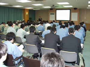 The presentation began with a salutation from Mr. Hiroshi Sakuma, Operating Officer of Tohoku Electric Power Company and Station Manager of the Onagawa Nuclear Power Station. "We are grateful to have this Safety Caravan being held here today. On this occasion, having been directed by the Nuclear & Industrial Safety Agency (NISA) to undergo a nuclear power plant quality assurance system comprehensive inspection, 17 items for effective measures to prevent recurrence have been formulated, and we have reported to NISA as well as local authorities. We hope to obtain the understanding that these measures are for the most part proper. Issues that we sensed through this quality assurance system comprehensive inspection are reformation of the consciousness and the way procurement should be managed. Three goals have been established as the renewal of our quality objective, which is one of the countermeasures against recurrence. The first is safety as the top priority, the second is getting into the habit of always asking questions, and the third is communication. We must work to regain the trust of the people in our region, never letting these simple objectives out of our sight, and continue to improve the quality of the power station and operate the station safely and stably.