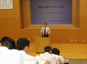 Mr. Higuchi lectured on the topic "Learning about Undesirable Organizational Activities -- Why We Keep Making the Same Mistakes Over Again" introducing the fundamental organizational causes that underlie all of the latest scandals and the posture of management. The lecture can be summarized as follows.
