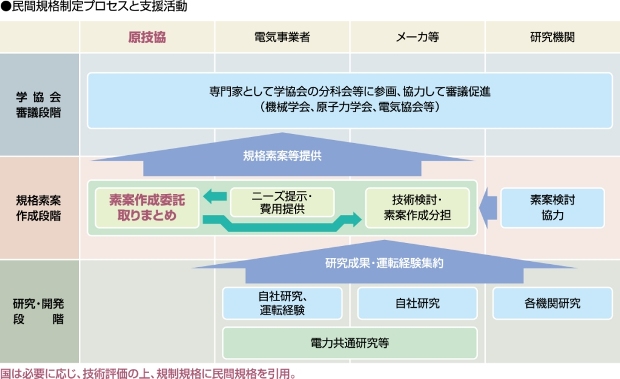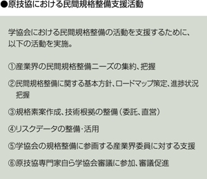 | 左記で抽出した個々の民間規格について素案作成などの支援活動を行う。また、活動を通じて得られた技術情報は、原技協の技術基盤として蓄積し、今後の活動を支えるベースとする。 |