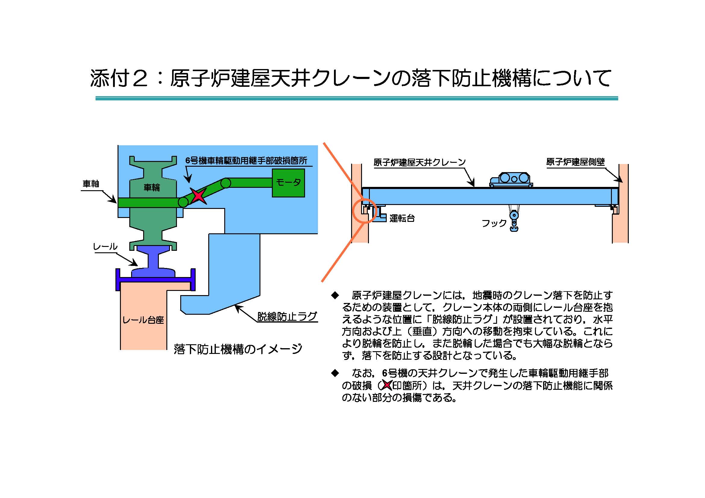 - 天井クレーンは脱線しておらず、天井からの落下の危険性がないことを確認している。(添付2参照)