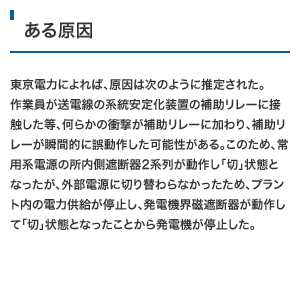 平成22年6月17日に東京電力福島第一原子力発電所2号機で原子炉が自動停止しました。この事象はある原因で発電機が停止して、原子炉が自動停止するとともに、非常用ディーゼル発電機が自動起動したものです。