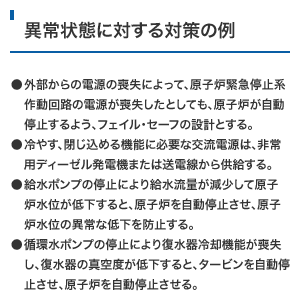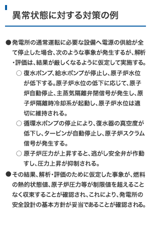 また、発電所外部からの電源が喪失した場合などのさまざまな異常状態に対する対策についての解析・評価が行われ、発電所の安全設計の基本方針の妥当性が確認されます。